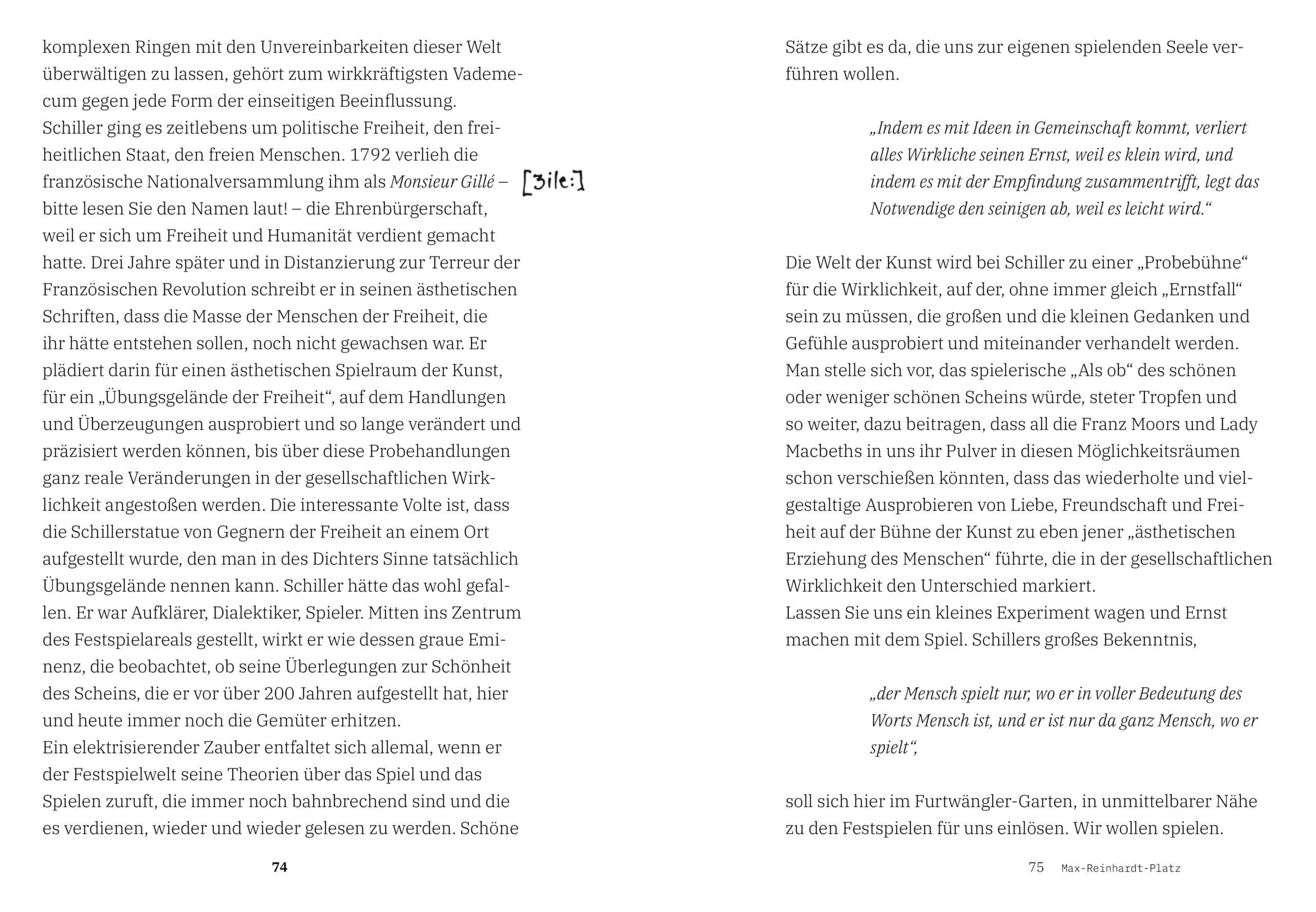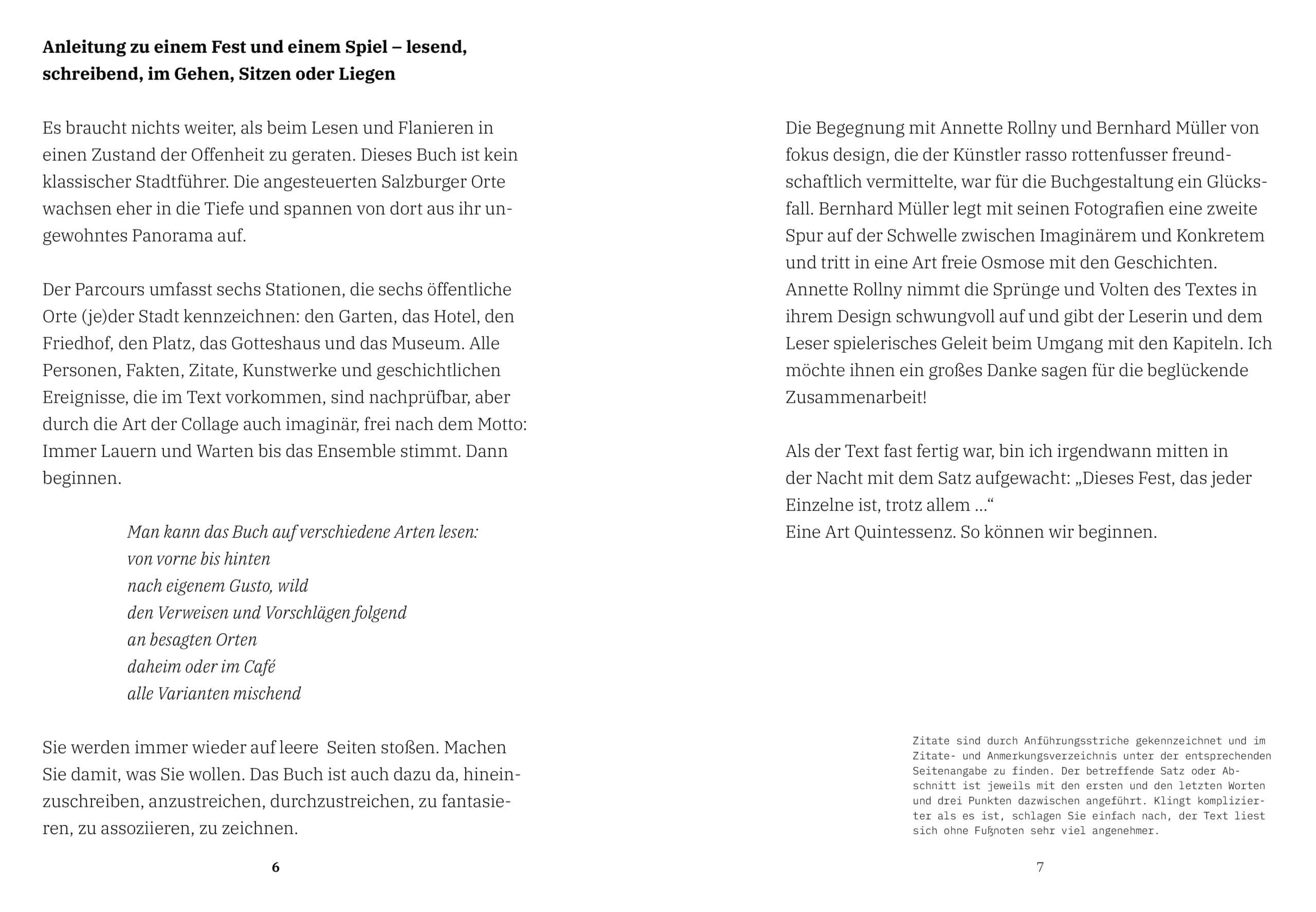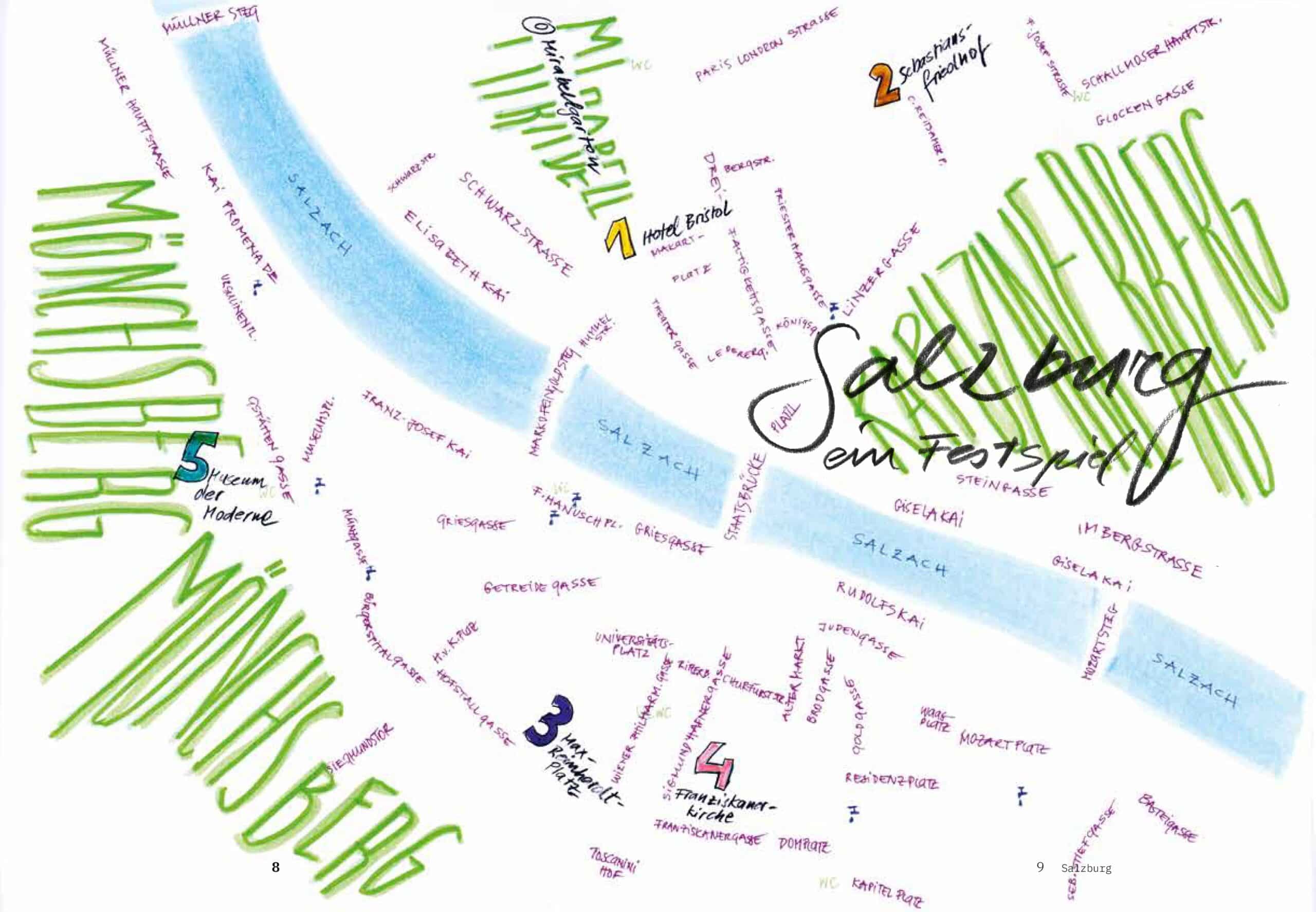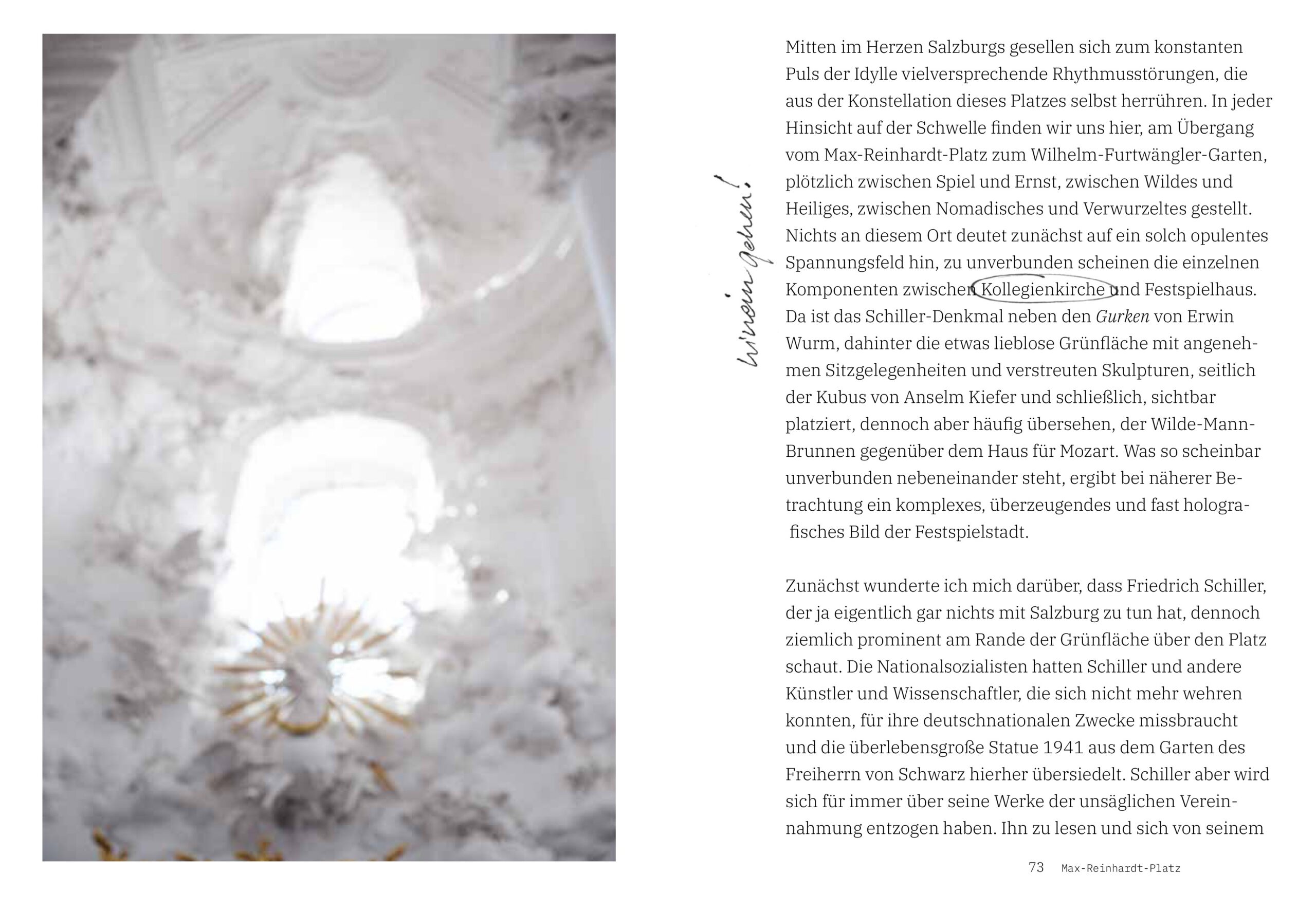 Salzburg – ein Festspiel bietet einen Ausstieg aus unseren vielfältigen Formen von Stadtalltag, auch dem touristischen. Es beleuchtet ausgewählte Salzburger Orte, Geschichten und Persönlichkeiten mit großer Lust am Aufspüren von ungewöhnlichen Konstellationen und Querverbindungen. Wer neugierig darauf ist, was die Mozartkugel mit den Lehren des Paracelsus zu tun hat, was uns barocke Falten und Spitzen heute noch zu sagen haben oder wie die Salzach ästhetische Theorien des 18. Jahrhunderts beeinflusst haben könnte, wird hier fündig.