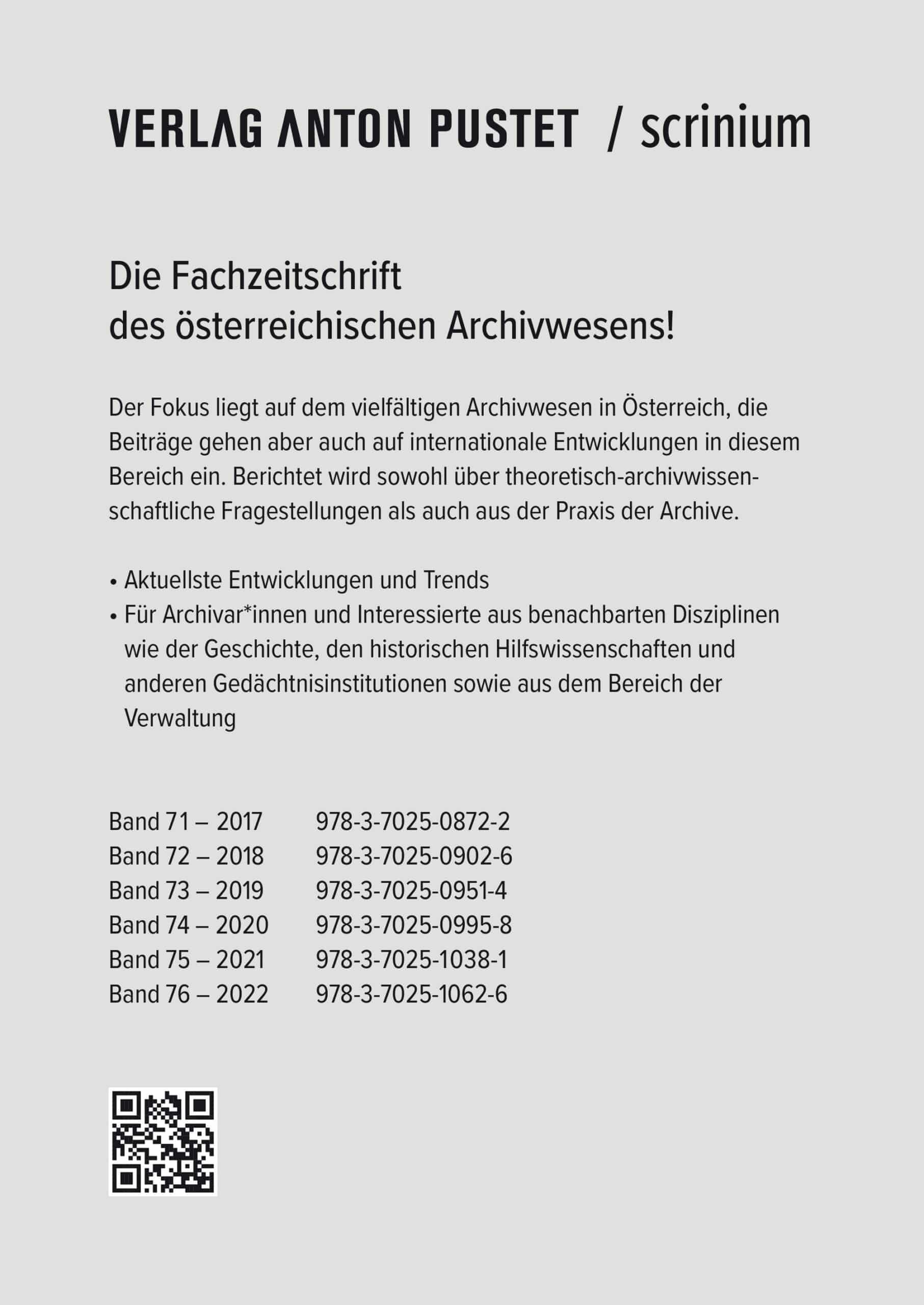 Das „Scrinium“, der Schrein oder Behälter zur Aufbewahrung wertvoller Schriftstücke, ist seit 50 Jahren titelgebend für die Verbandszeitschrift Österreichischer Archivarinnen und Archivare. Deren Aufgabe ist es, schriftliches Kulturgut für künftige Generationen zu bewahren und zugänglich zu machen.